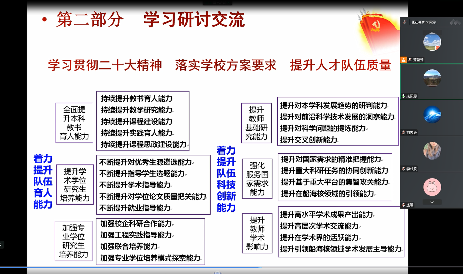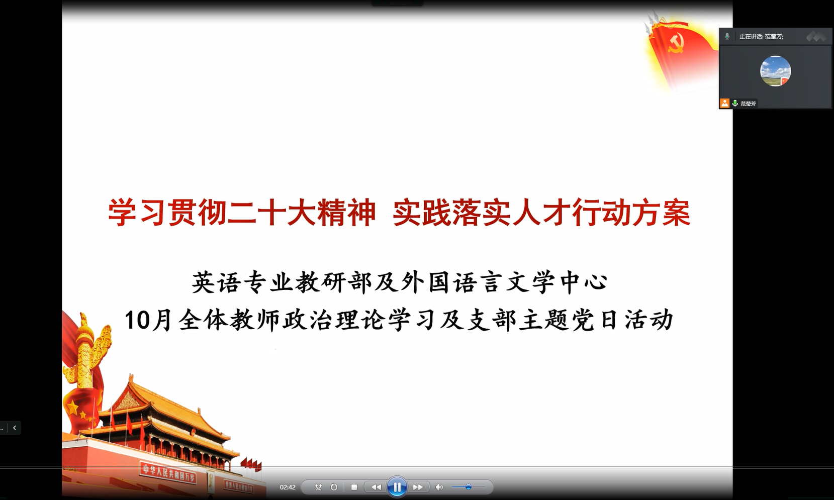 英语专业教研部及外国语言文学中心党支部于2022年11月2日召开10月党的创新理论学习及“学习贯彻二十大精神 实践落实人才行动方案”线上主题党日活动,朱殿勇院长作为部门主管领导参加本次活动。会上对二十大精神专题、“反腐倡廉每季一课”党风廉政建设专题展开学习。参会教师结合学习贯彻落实二十大精神、落实学校人才队伍高质量发展三年行动方案要求、提升部门人才队伍质量进行了研讨交流。