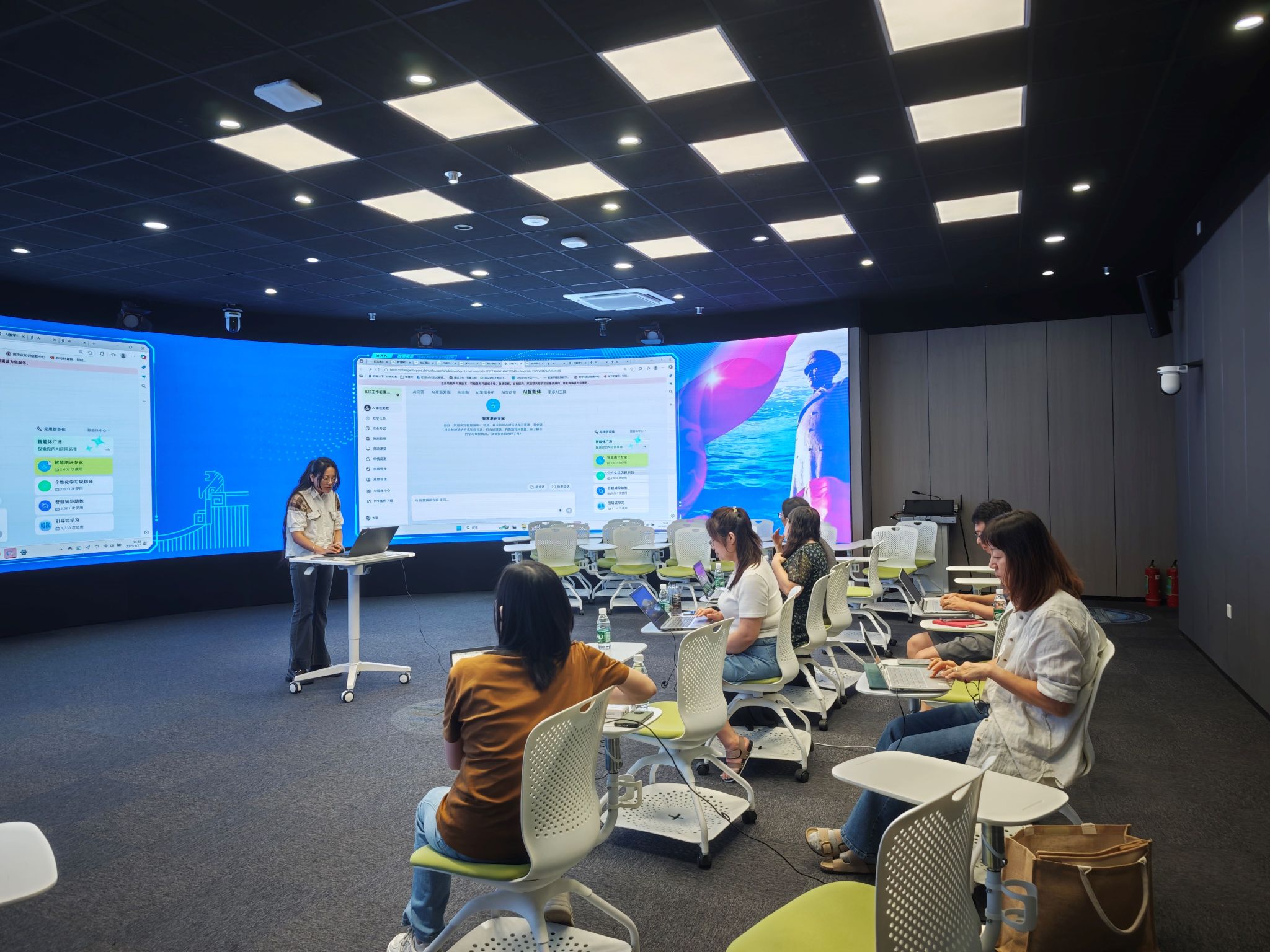 在实操环节,教师们结合自身课程需求进行平台操作练习,智慧树工作人员现场巡回指导,逐一解答教师们在资源上传、课堂互动设计、AI智能体运行等环节的疑问,确保每位教师都能独立完成从课前准备到课后评价的全流程操作。参训教师纷纷表示,此次培训“干货满满”,通过实操演练切实感受到数智技术对教学全流程的赋能作用。未来,教研室将持续探索AI与英语教学的深度融合,推动研究生公共英语课程向智能化、个性化方向升级,为培养高层次复合型人才注入新动能。