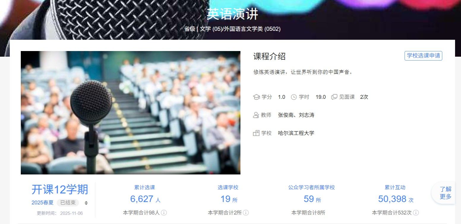 《英语演讲》课程的建设历程体现了持续创新、追求卓越的专业精神。课程于2020年9月在智慧树平台首次上线,开启了线上教学的全新探索。经过七个学期的完整运行和持续优化,课程于2023年10月获评黑龙江省线上一流课程,这一阶段性成果为后续发展奠定了坚实基础。在获得省级认定的基础上,课程团队继续深化建设,不断完善课程内容和教学方式。课程负责人张俊南带领团队对教学内容进行精细化打磨,优化课程结构,丰富教学资源。经过两年精心打磨,课程最终在2025年成功跻身国家级一流课程行列,完成了从平台上线到国家级金课的跨越式发展。